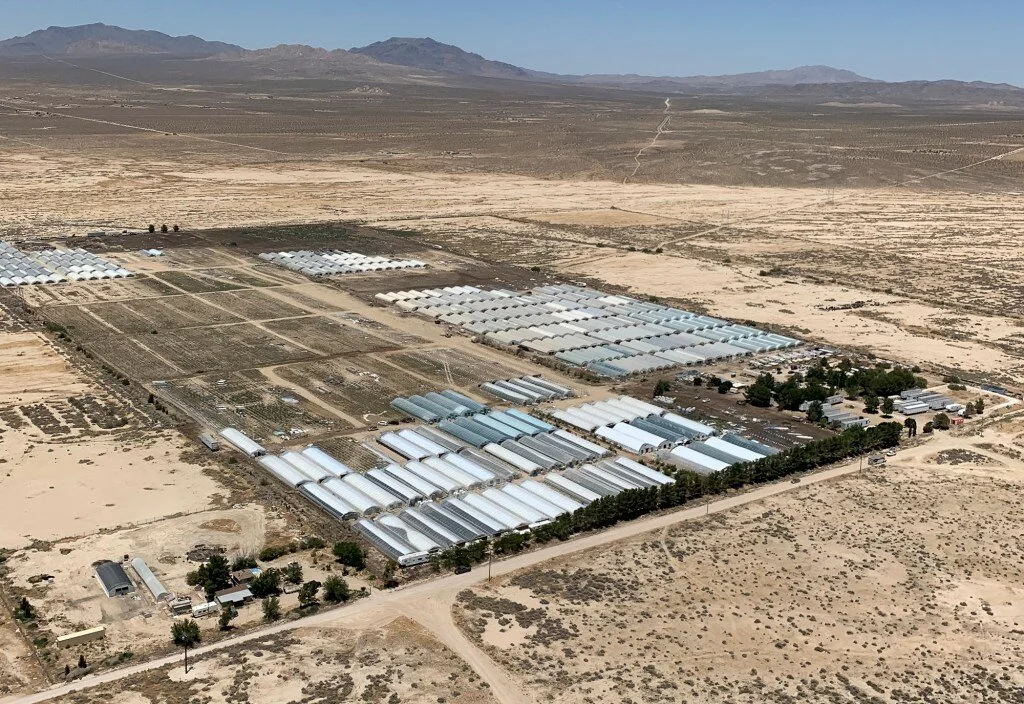 Stark white “hoop houses” rise from the flat desert floor. When lit at night, the compounds cast an eerie glow. Operators make little effort to hide the sites, which are littered with trash baking in the Mojave Desert sun and guarded by armed men. Scattered along the road to one site was a porcelain toilet, plastic chairs and a coiled garden hose. Bulldozed Joshua trees lay in haphazard piles. The fender of a rusting truck was spray painted “out” and next to it was another one with “keep” scrawled on the side.